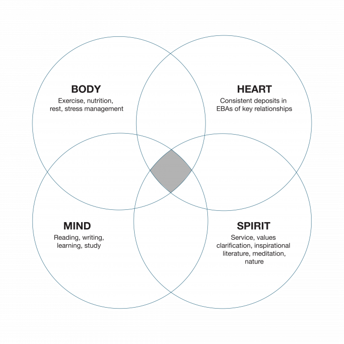 Sharpen the Saw means preserving and enhancing the greatest asset you have—you. It means having a balanced program for self-renewal in the four areas of your life: physical, social/emotional, mental, and spiritual.