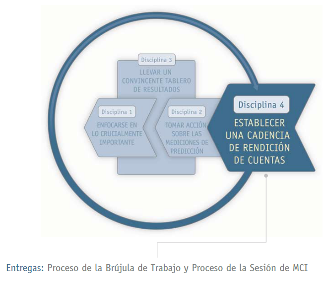 El secreto de la Disciplina 4, además de la cadencia semanal, son los compromisos que los miembros del equipo crean en la reunión. Uno por uno, los miembros del equipo responden una sencilla pregunta: “¿Cuáles es una cosa o son dos cosas más importantes que puedo hacer esta semana que tendrán el mayor impacto en el tablero de resultados?” En la reunión, cada miembro del equipo informa primero si cumplió con los compromisos de la semana pasada, segundo si los compromisos mueven las Mediciones de Predicción o Históricas en el tablero de resultados y por último qué compromisos harán para la siguiente semana.