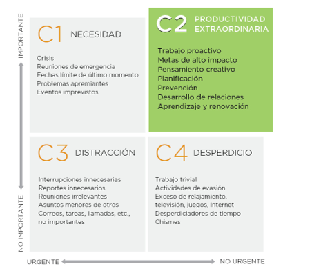 La Matriz del Tiempo es una herramienta para clasificar cada actividad a través del cerebro pensante, con un sesgo hacia las cosas que son importantes, pero no urgentes (el cuadrante C2 de la productividad extraordinaria). Cuanto más tiempo podamos dedicar a la C2, menos nos ocuparemos de las urgencias de los demás.