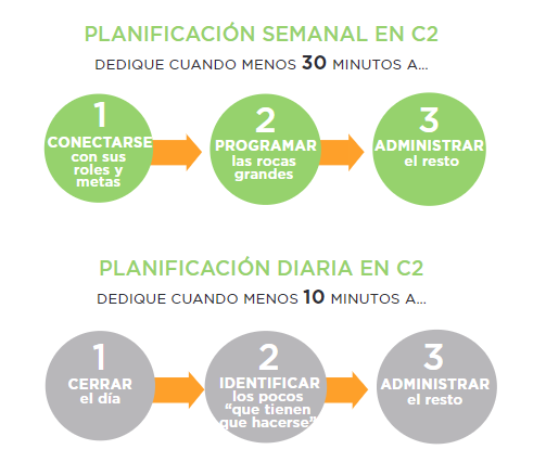 En la Planificación de C2 dedica un tiempo para aquietar su mente, y luego elija las Rocas Grandes de su semana y de cada día para asegurar que se cumplan. Al alejarse del ruido y enfocarse, se obtienen resultados más claros cuando uno se pregunta: “¿Qué es lo más importante?” y construye las respuestas en un plan de acción.