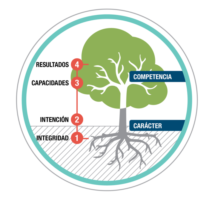 La integridad y la intención son los cimientos del carácter. La Competencia es el resultado de Capacidades y Resultados. Los líderes deben demostrar los 4 núcleos de credibilidad para inspirar confianza.