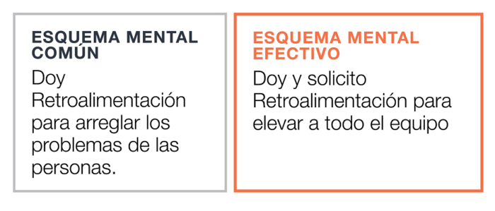 La esquema mental del líder inefectivo es pensar en sí mismo como el solucionador: su equipo tiene problemas, por lo que piensa que es su trabajo señalar lo que el equipo está haciendo mal a través de la retroalimentación. Por el contrario, el esquema mental efectivo tiene que ver con liberar el potencial de los demás, incluido el propio líder, cuando buscan retroalimentación.